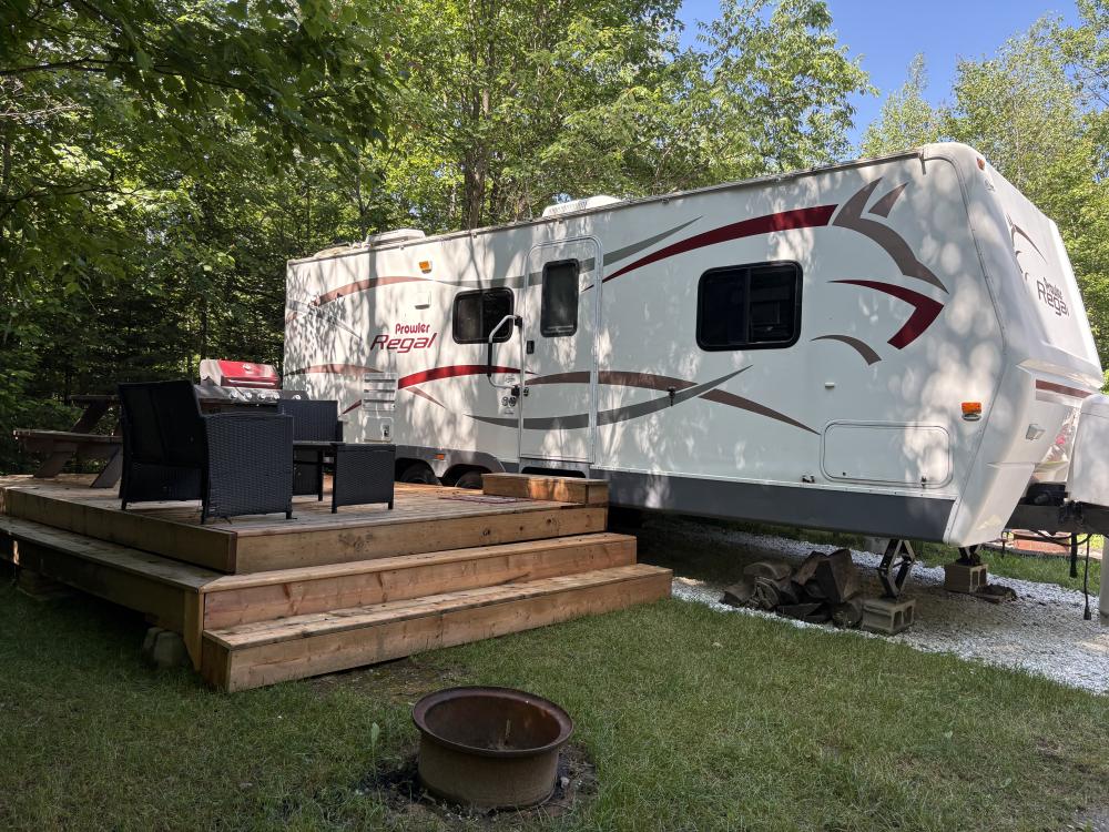 The two camping spots at Station touristique Baie-des-Sables in Lac-Mégantic offer access to electricity and a...